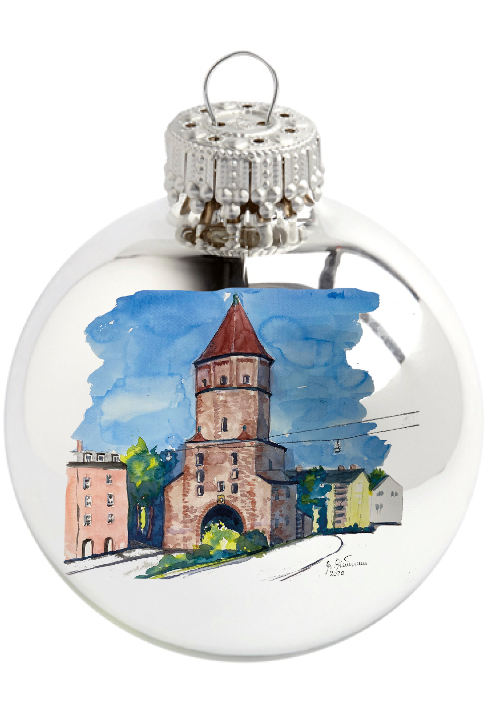 Bild auf Kugel: Augsburg/ Deutschland- Fünfgratturm, genannt auch „Fünffingerlesturm“- Ein alter Wehrturm, erbaut 1454. Er steht unter Denkmalschutz. Maltechnik der Bildvorlage: Aquarell