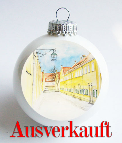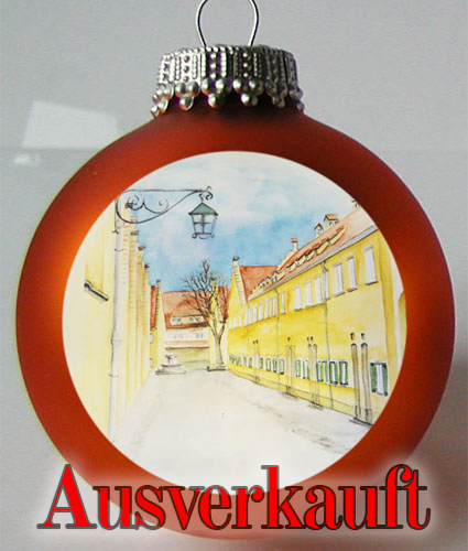Bild auf Kugel: Augsburg/ Deutschland- Fuggerei- Die Fuggerei ist die älteste bestehende Sozialsiedlung der Welt. Maler des Bildes: Christina Weber, wohnhaft in Augsburg, geboren 1958 in Grafenau