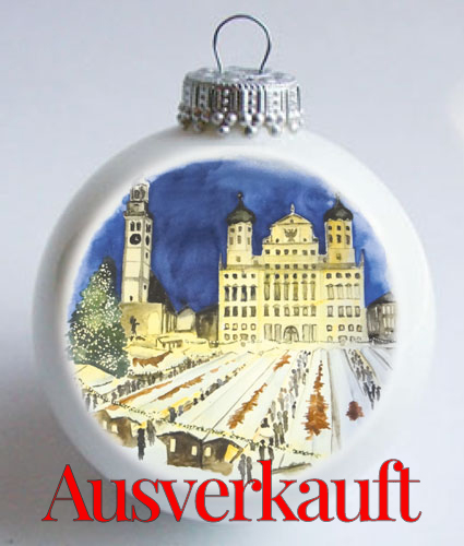 Bild auf Kugel: Augsburg/ Deutschland- Rathausplatz mit Perlachturm, dem Rathaus- und dem Augsburger Christkindlesmarkt Maler des Bildes: Christina Weber, wohnhaft in Augsburg, geboren 1958 in Grafenau
